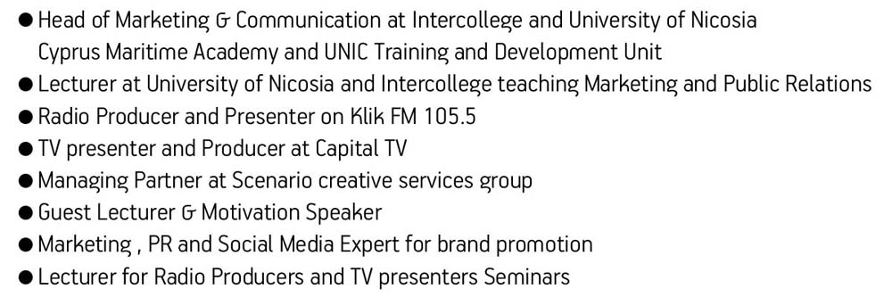 Guest Lecturer / Invited Talks (2007 - Present) University of Cyprus, Cyprus University of Technology, European University Cyprus, Birmingham City University. Course titles: Marketing and Public Relations. Organize conferences and establish contacts with the wider academic community. Invited to present lectures, lead discussions and encourage debate. Engage students/audience in real-world discussions and activities to enhance learning experience. |